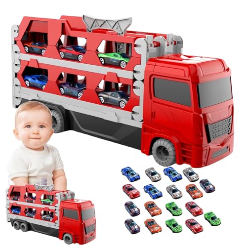 Car Transporter Truck Toy – Vehicle with 18 Cars – Foldable Toy Truck with Transport Track for Indoor, Outdoor, Travel, Christmas and Birthday Party