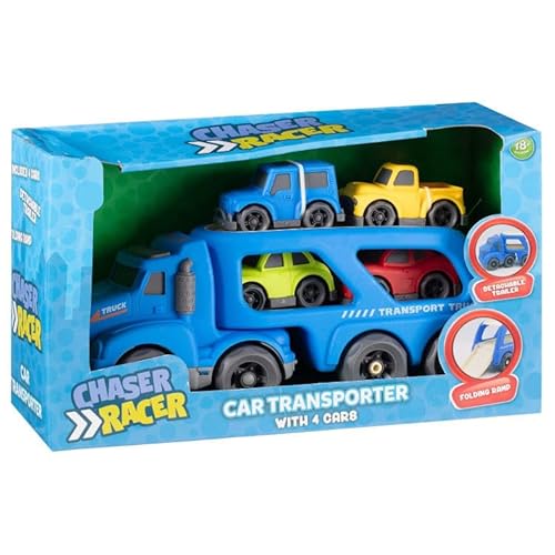 BargainsMania Blue Transporter Chaser Racer Car - Car Transporter With 4 Cars, Perfect For Zooming Around And Having Hours Of Fun.