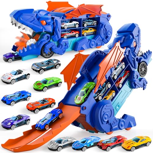 Hymaz Dinosaur Toys for 3 4 5 6 Years Old Boys Gifts, 3-in-1 Carrier Transporter Truck Toys with 12 Race Cars, Transforms into Dino, Foldable Sliding Race Track Car Toy Set for Kids Boys Girls (Blue)