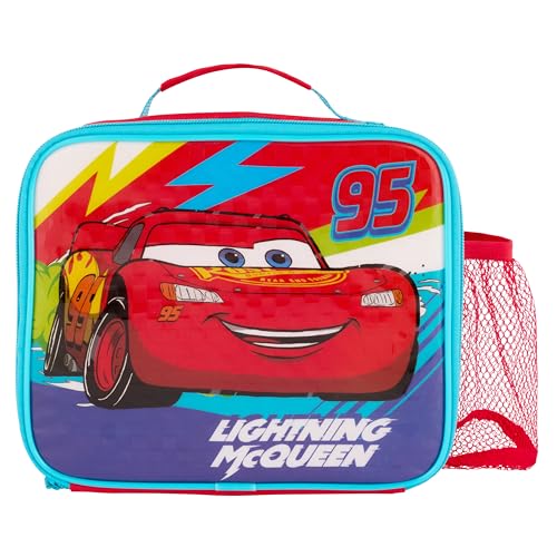 Disney Cars Lightning McQueen Insulated Lunch Bag with Wipe Clean Antibacterial Lining & Mesh Bottle Pocket, Red, for School & Travel
