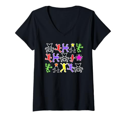 Womens Keith Bright Wallpaper Lithograph Cartoon, Bold Grafitti Art V-Neck T-Shirt