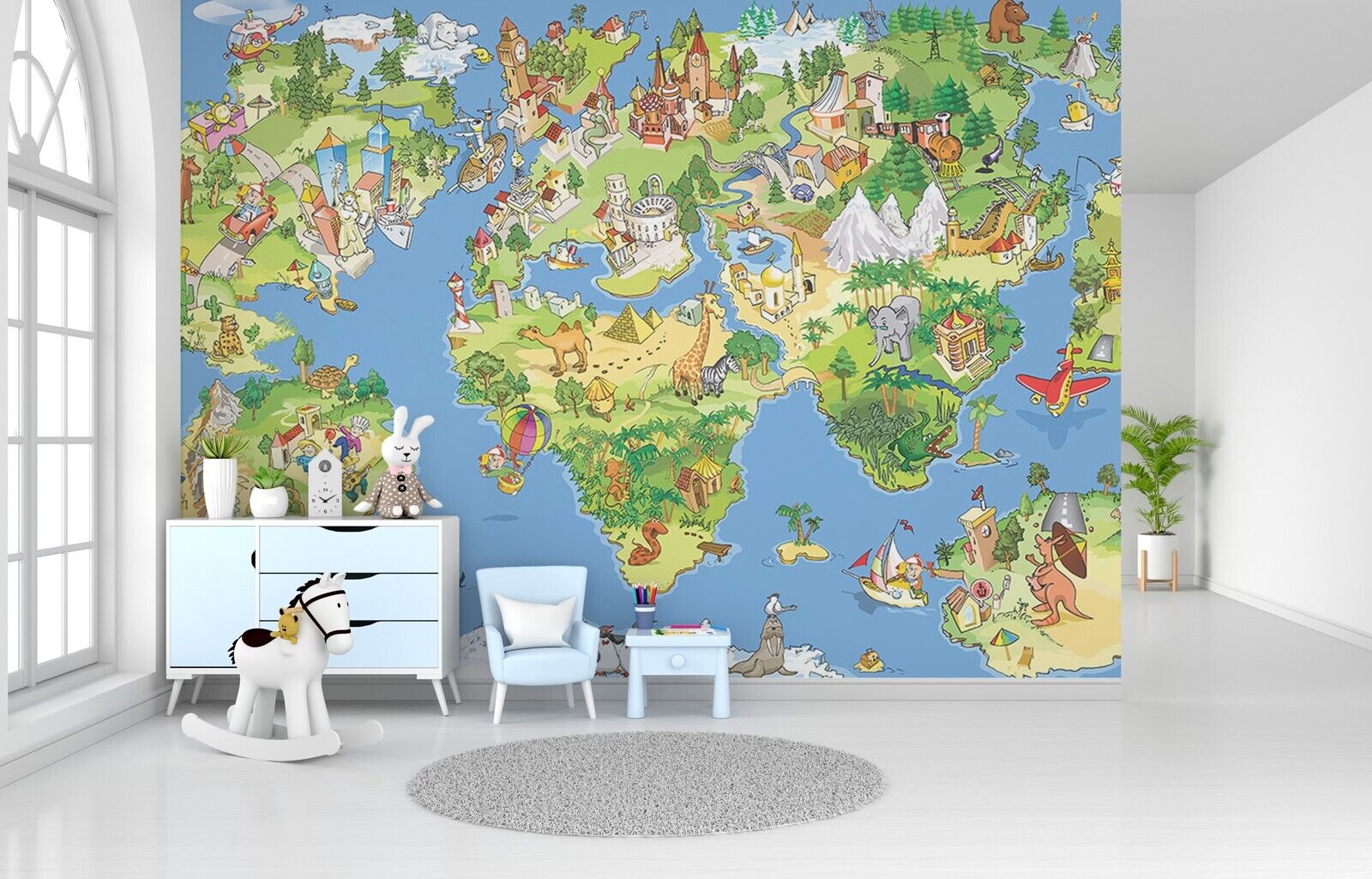 Nursery Map wallpaper wall mural Cartoon Animals green blue 320x230cm kids decor