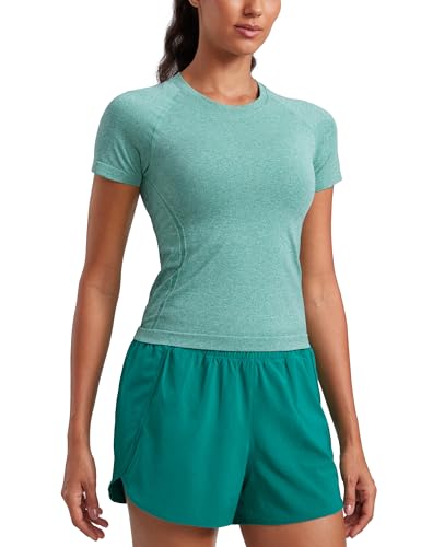 CRZ YOGA Women's Seamless Short Sleeve Shirts Breathable Running Yoga Plain Top Stretchy Sport Gym Fitness Basic T-Shirt Cascadia Green 16