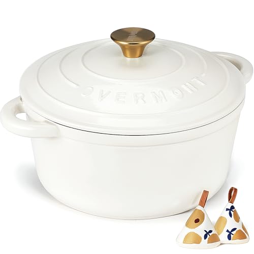 Overmont 26cm/5.2L Enamelled Cast Iron Round Casserole Dish With Lid,5.5QT, Cookbook -Non-stick Dutch Oven for Braising, Stews, Roasting, Bread Baking - Pearl White