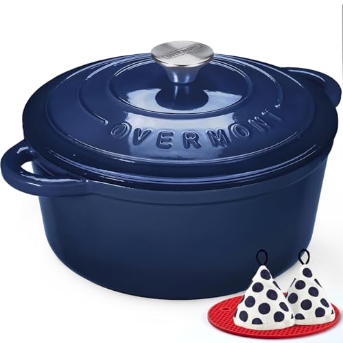 Overmont 26cm/5.2L Enamelled Cast Iron Round Casserole Dish With Lid,5.5QT, Cookbook -Non-stick Dutch Oven for Braising, Stews, Roasting, Bread Baking -Indigo