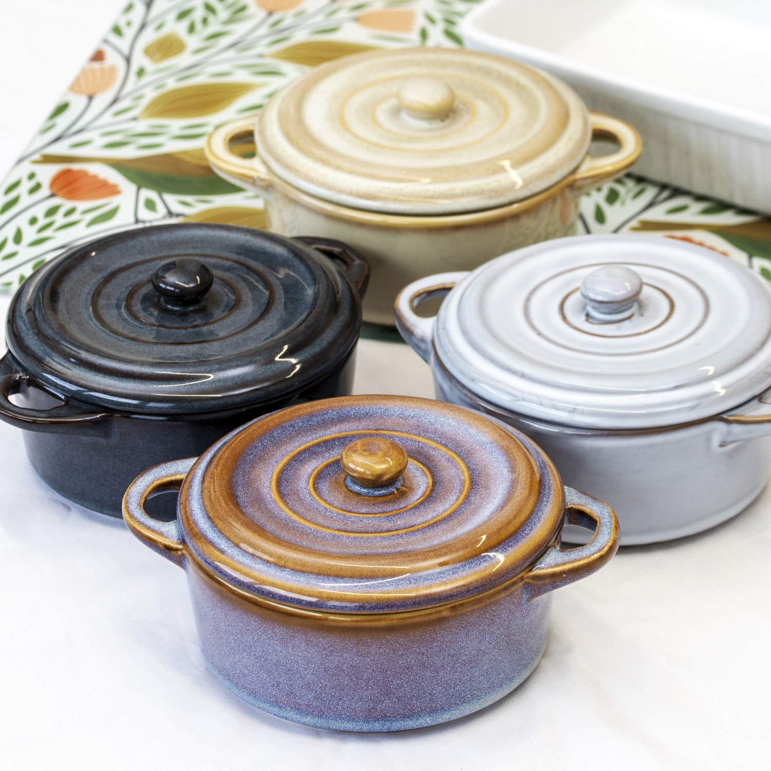 Set Of 4 Small Round Reactive Glaze Casserole Dishes Stoneware Oven Pots Lids