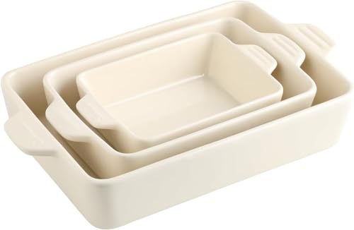 MALACASA Casserole Dishes for Oven, Ceramic Baking Dishes Set of 3, 1.45/2.7/3.8L Rectangular Baking Pan Set, Deep Lasagna Pan with Handles, Khaki White (14.5"/13"/10.5"), Series TARA