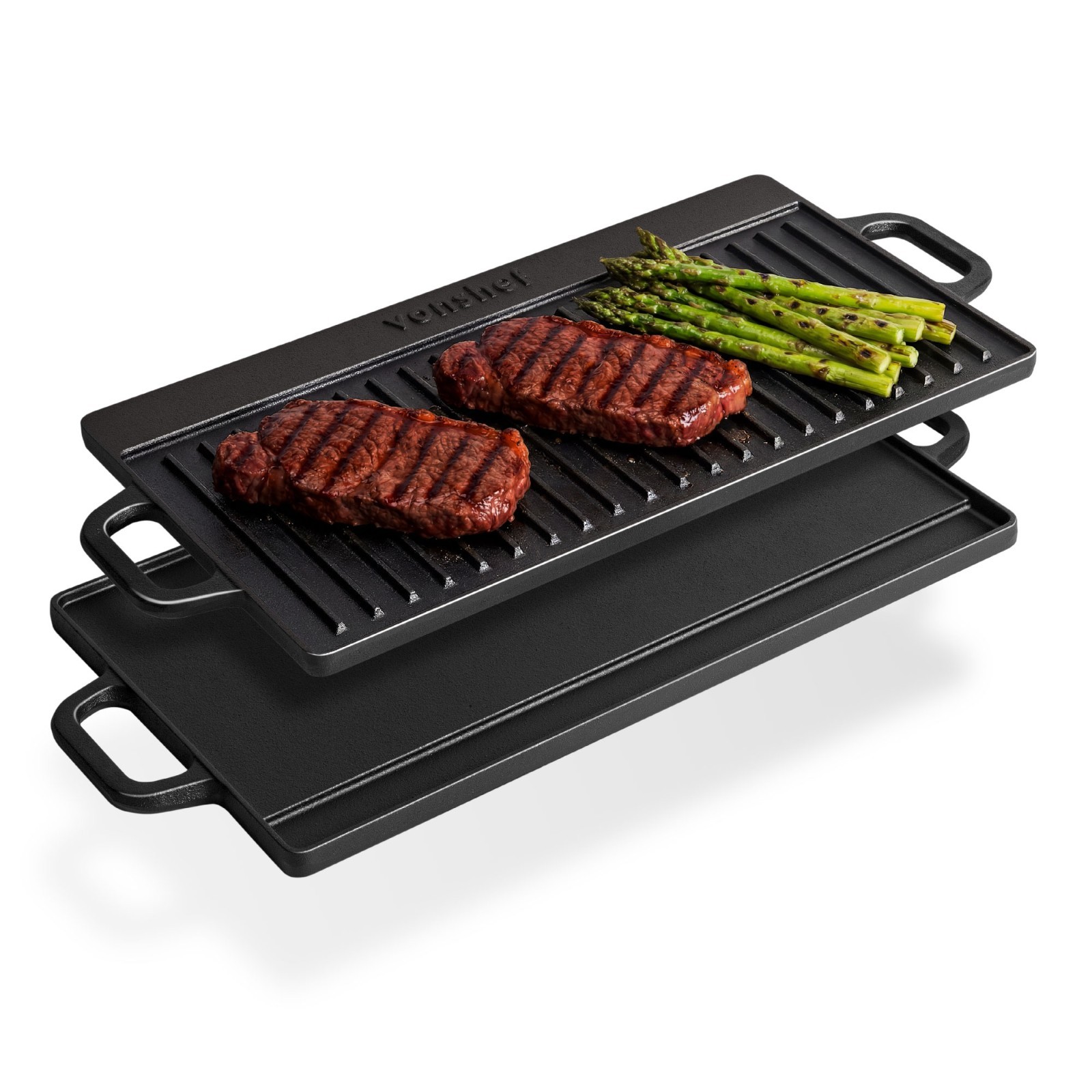 VonShef Reversible Griddle Pan, Pre-Seasoned Non-Stick Cast Iron BBQ Griddle with Handles, Oven Safe Flat Pan for All Hob Types