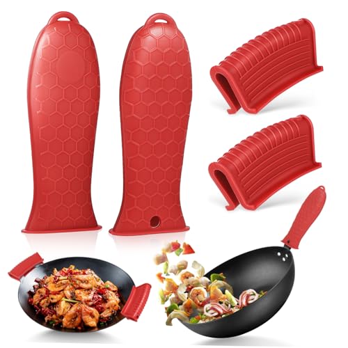 BELLIFFY Silicone Hot Handle Covers for Cast Iron Pots and Pans, Red 4pcs Set with Honeycomb Texture, Heat-resistant Pan Grip Sleeves and Pot Handle Holders for Kitchen Use