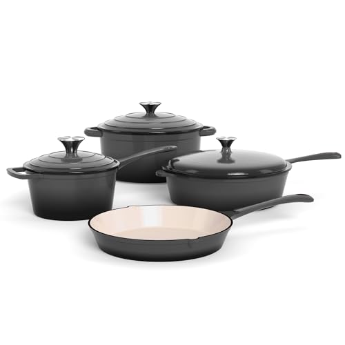 Kitchen Academy, Enameled Cast Iron Cookware Set, 7 Piece Set of Dutch Ovens, Sauce Pan, Skillet, 3 Lids, Dutch Oven Set, Pots and Pans Set Nonstick (Grey)