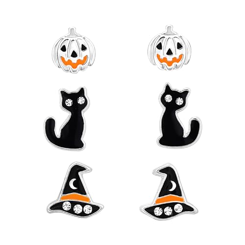 The Rose & Silver Company Women Girls 925 Sterling Silver Pumpkin Black Cat and Witch's Hat Set on Card Crystals Stud Earrings