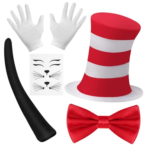 Cat Hat Bow | Red White Striped Cat in The Hat Costume Set | Cosplay Accessories with Gloves Bowtie Halloween Props for Women Men Kids Boys Girls Festival Event