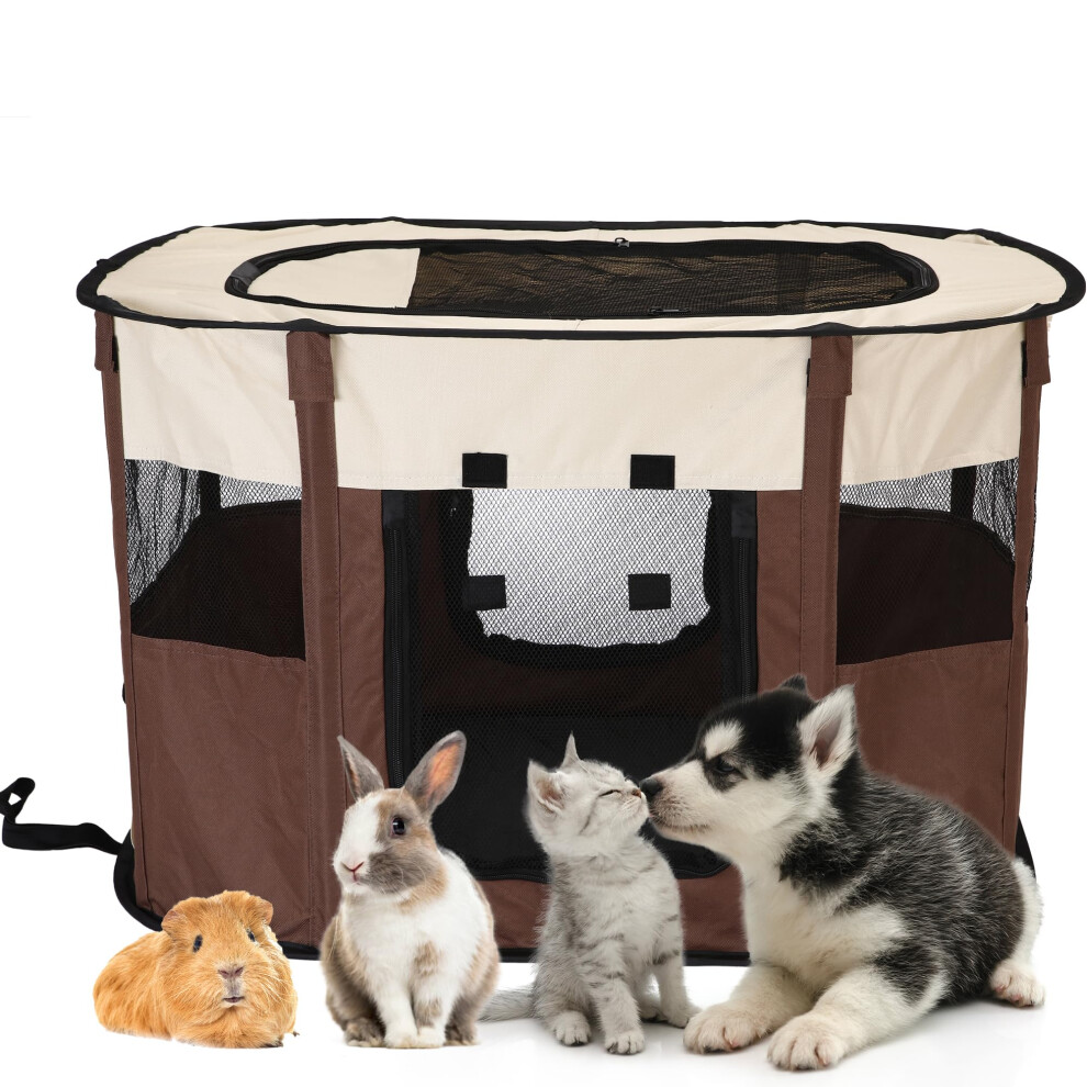 Sea Team Foldable Pet Playpen, Sturdy Odor-Free Portable Dog Cat Cage, Indoor Outdoor Puppy Playpen with Mesh Panels,BROWM S