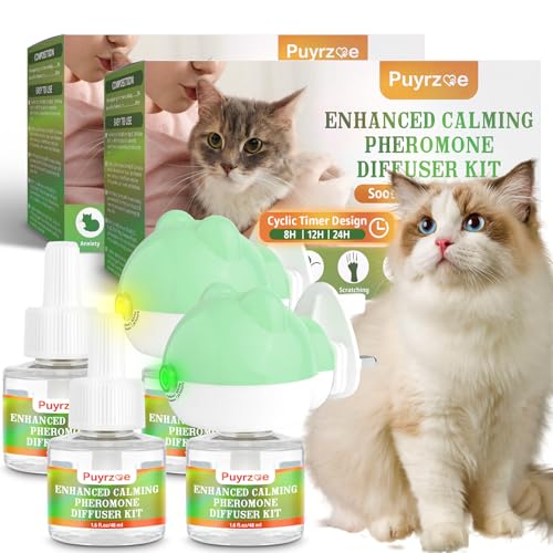 Puyrzoe Cat Calming Diffuser with Three Timing Functions, 6-IN-1 Cat Pheromones Calming Diffuser Kit, 120-Day Cat Calming Plug-in Support Anxiety, Stress, and Relaxation for Cats 2 Diffusers+4 Refills