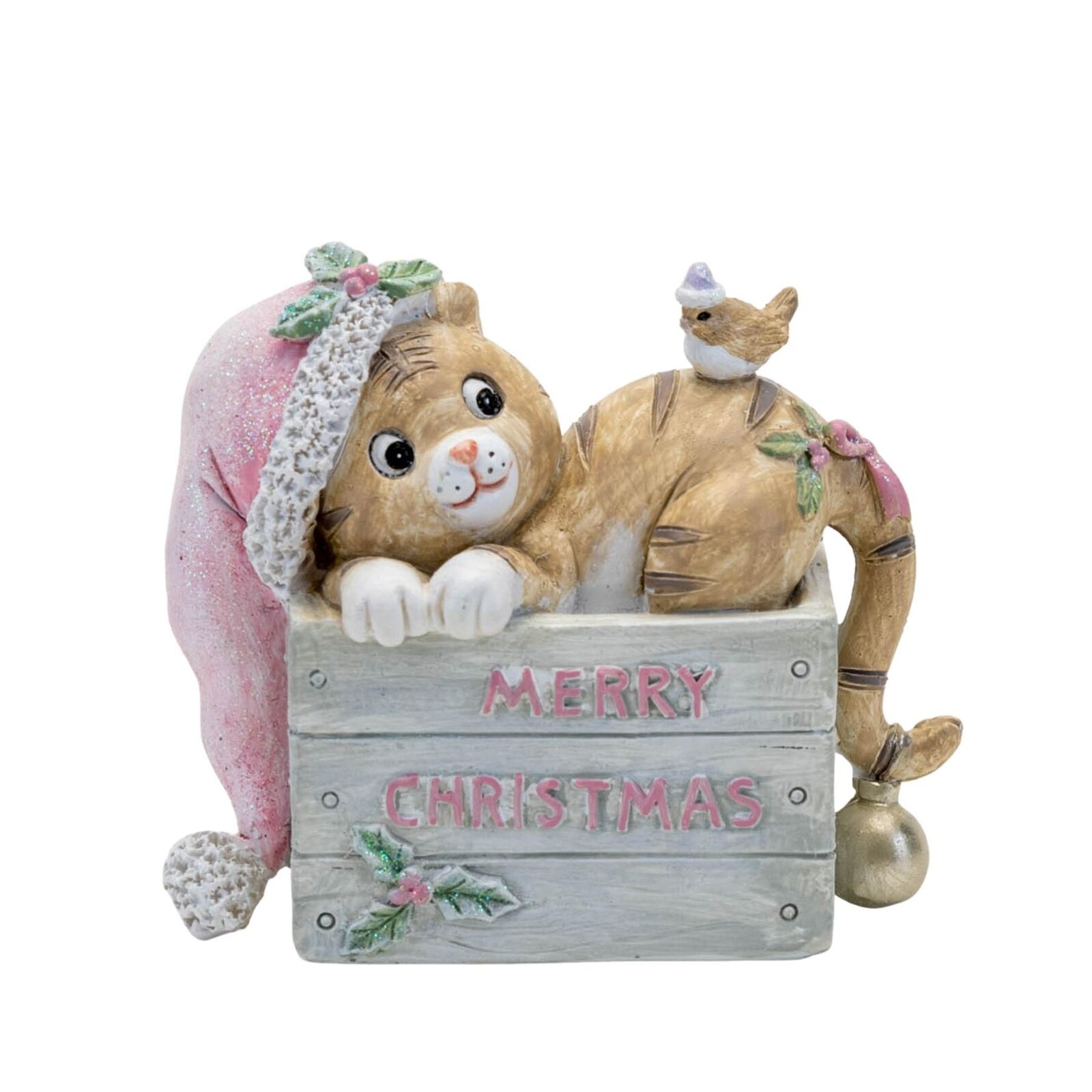 Christmas Cat Figurine Ornament Decoration - Cat in Crate / Merry Christmas