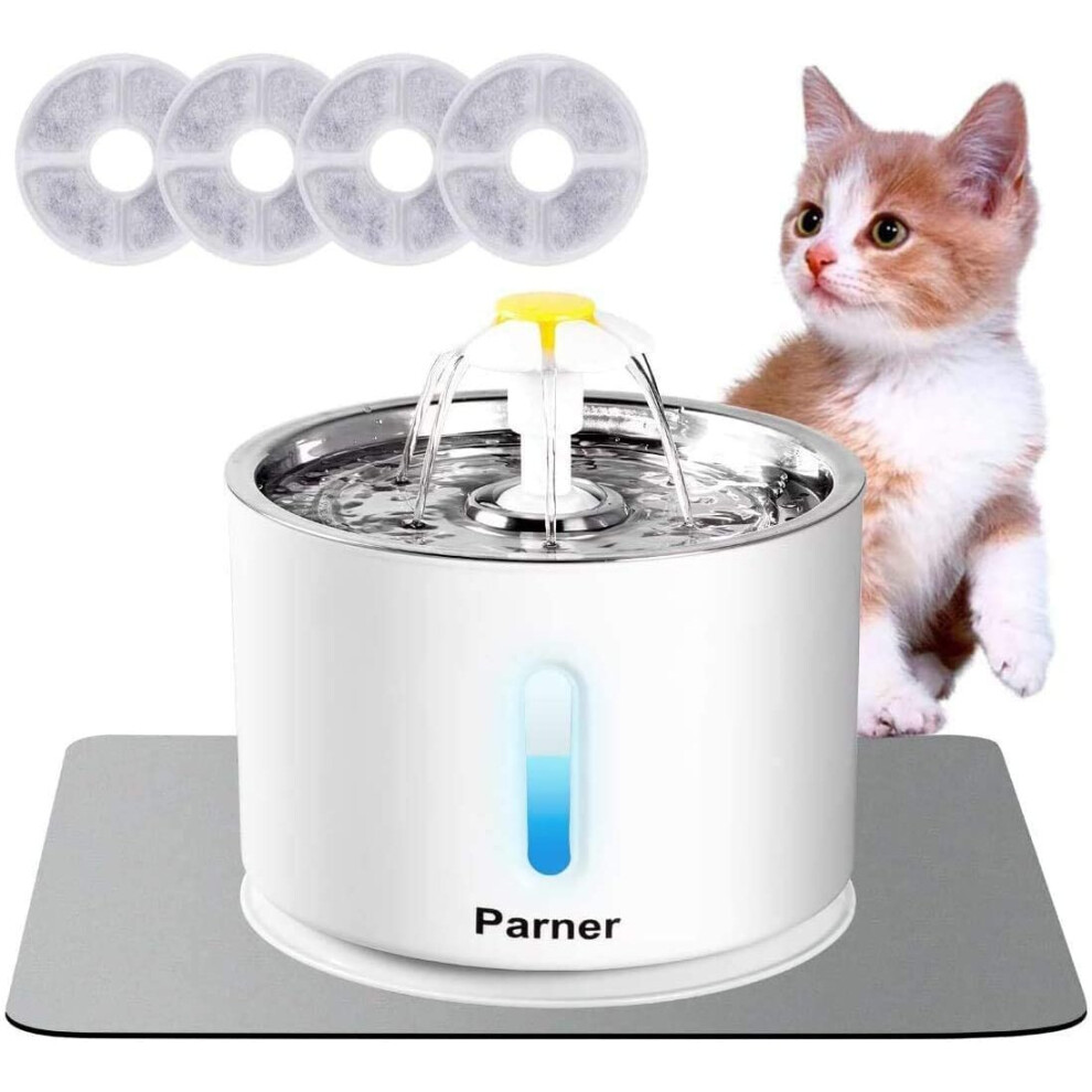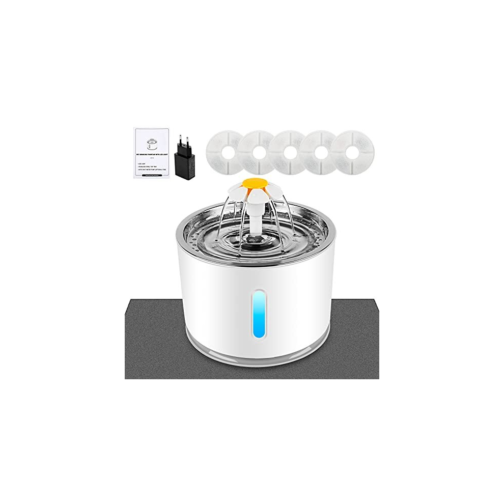 Cat Drinking Fountain, Water Dispenser for Cats with Water Level Window, Cat Water Fountain Stainless Steel with 4 Pieces Hygiene Filter & 1 Silicone Mat, Drinking Fountain for Pets with LED Light