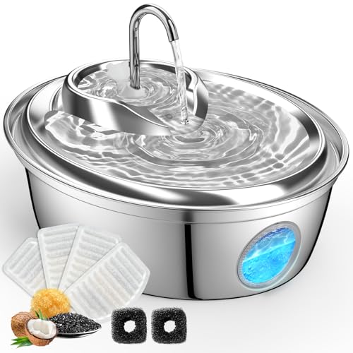 BalimoPet Cat Water Fountain for Drinking: 2.6L Stainless Steel Cat Water Fountain, Multiple Filtration Pet Water Fountain, Built-In Led, Ultra Silent with 3 Sponges and 3 Filter