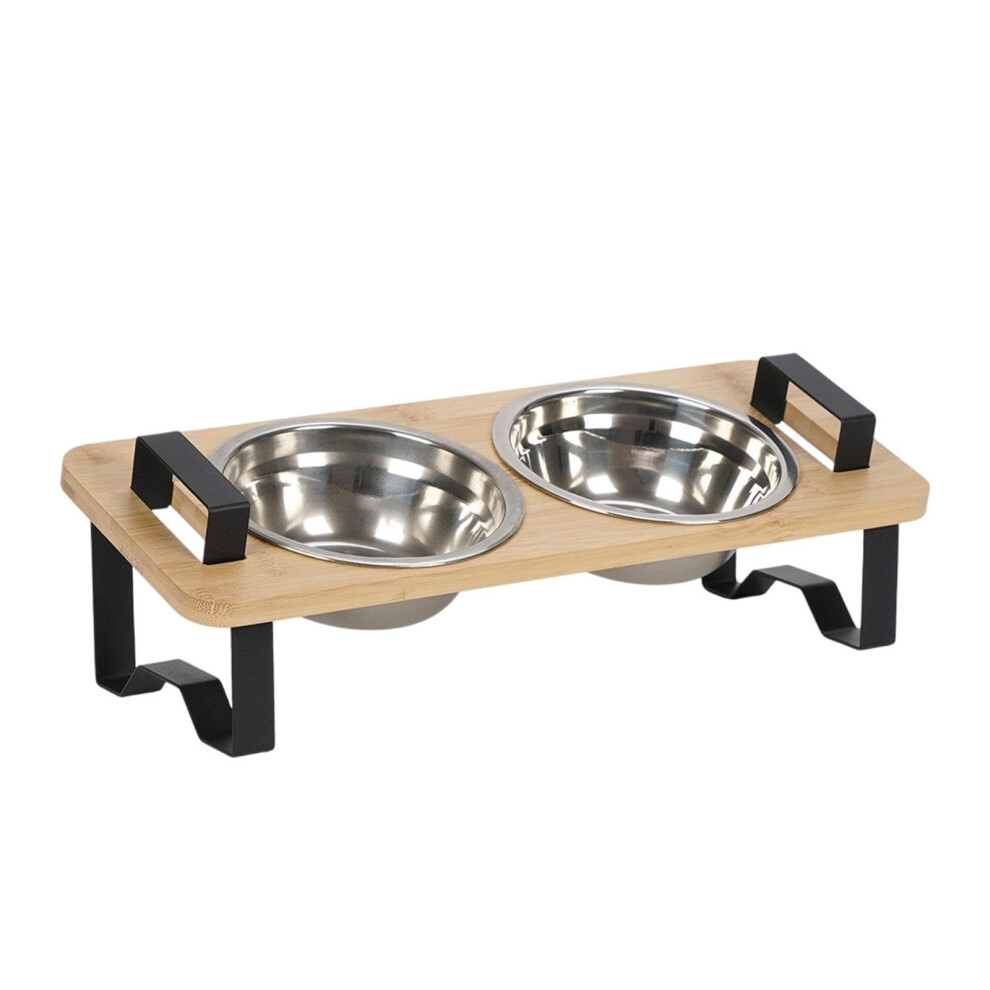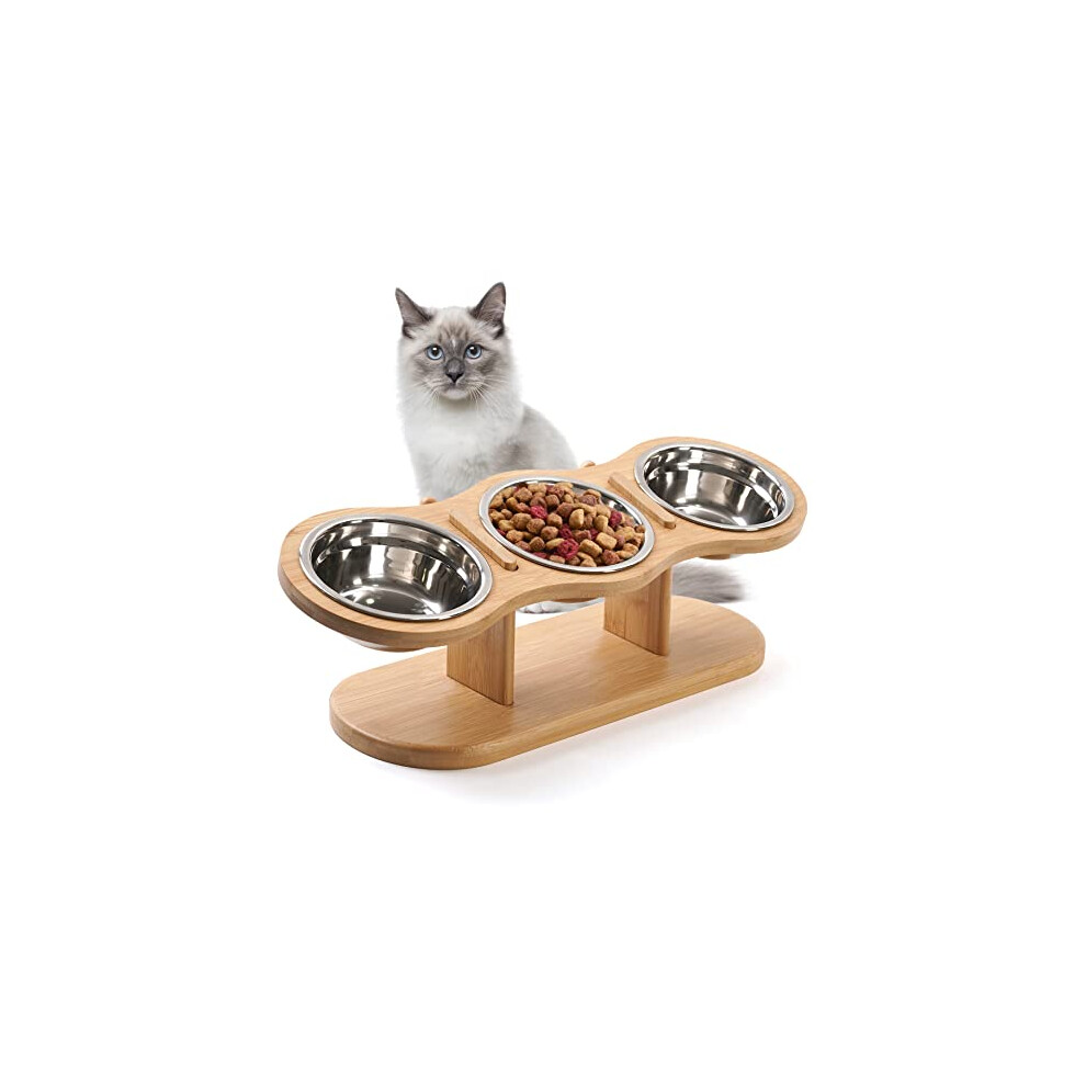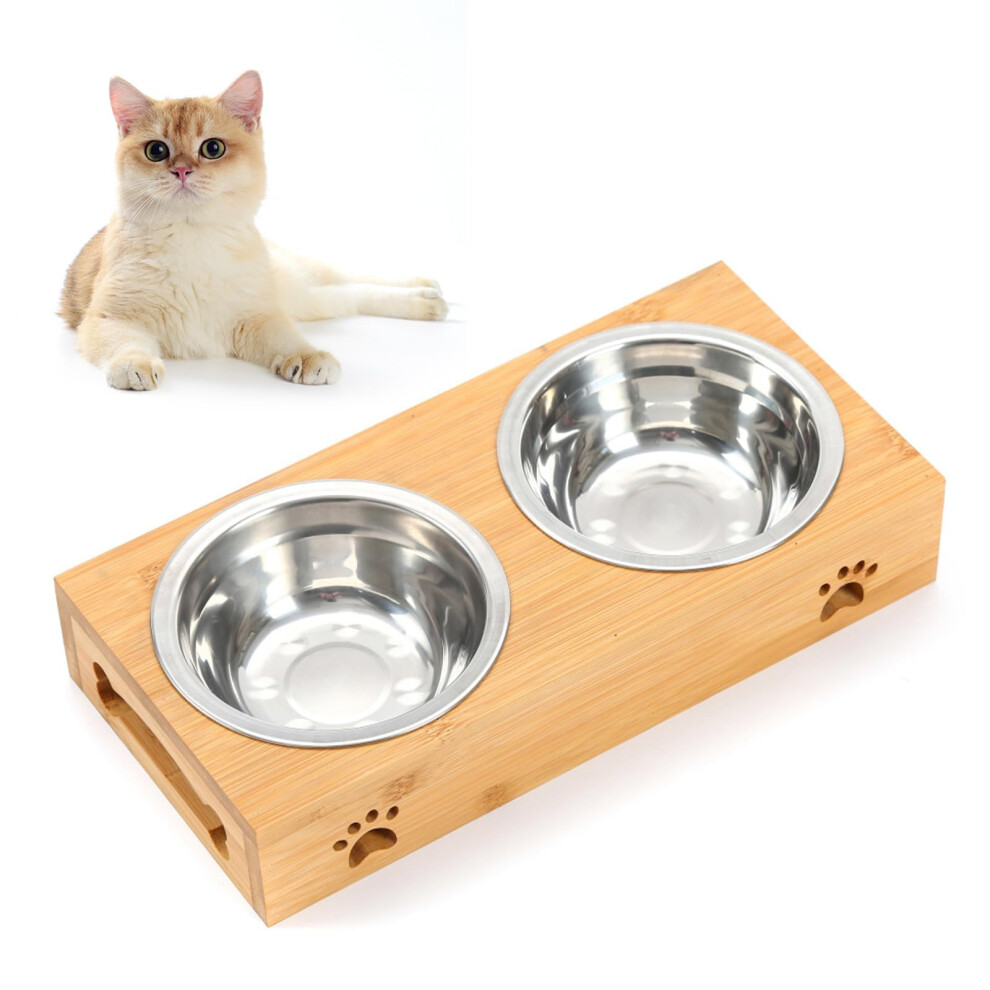 Raised Cat Bowls with Stand Cat Feeding Station Bamboo Base 2 Stainless Steel Bowls Elevated Cat Food Bowls Small Puppy