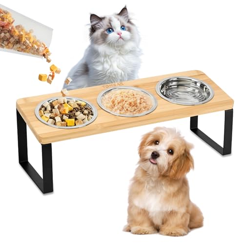 Raised Cat Food Bowl Set, 3PCS Stainless Steel Cat Bowls with 15° Stand Tilted, Upgrade Cat Feeding Station for Food and Water, Anti Vomiting, Premium Bamboo Elevated Cat Bowl for Cats & Small Dogs