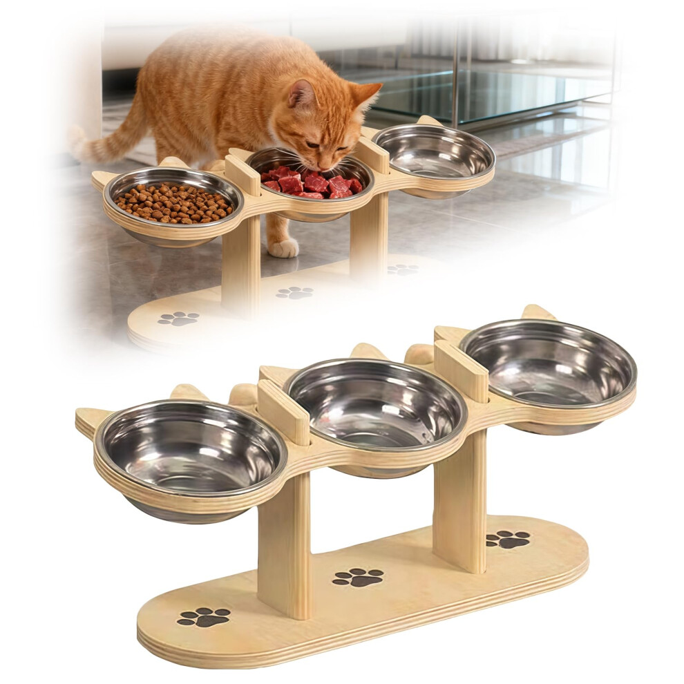 Raised Cat Bowl Feeding Station With 3 Stainless Steel Bowls Wooden Stand For Cats Puppies Small Dogs Wet And Dry Food