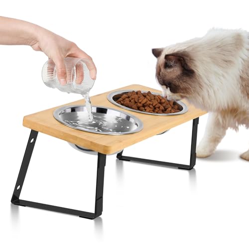 Elevated Cat Bowls, Small Dog 15° Tilted Raised Stainless Steel Bowl Stand, Solid Bamboo Food Water Bowl Set Feeding Station for Pets