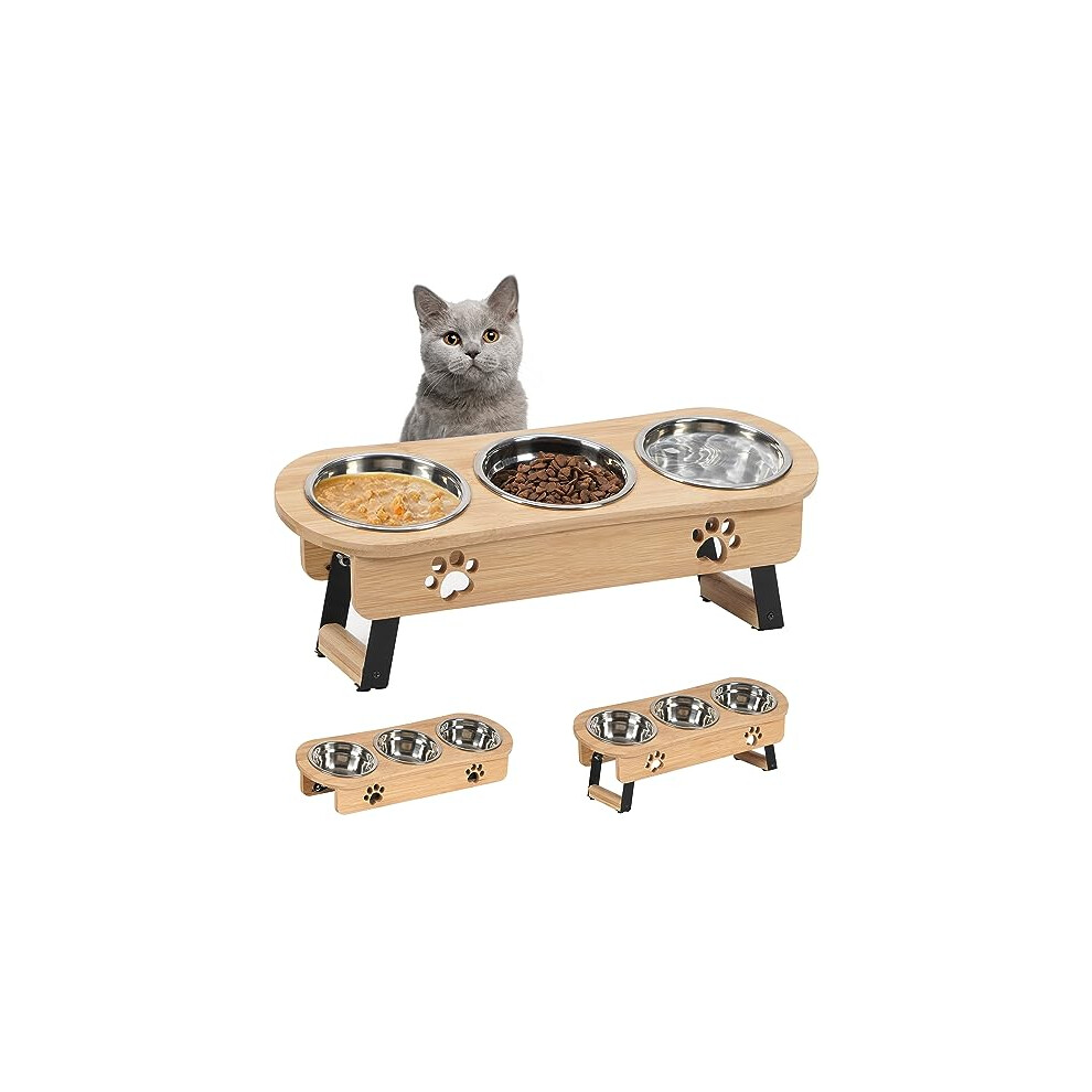 GHIAKQYT Cat Feeding Station, 3 Bowls, Raised Cat Bowl, Set of 3, Height Adjustable, Feeding Bowl with Wooden Stand, Stainless Steel Bowls for Water