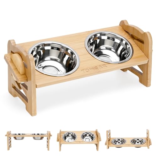 Raised dog Bowl, elevated dog bowls,6-Level Adjustable Raised, Bamboo Dog Feeding Station, 2 Stainless Steel Pet Bowl, dog bowls with stand for Dog and cat Raised Feeders(For small Dogs)