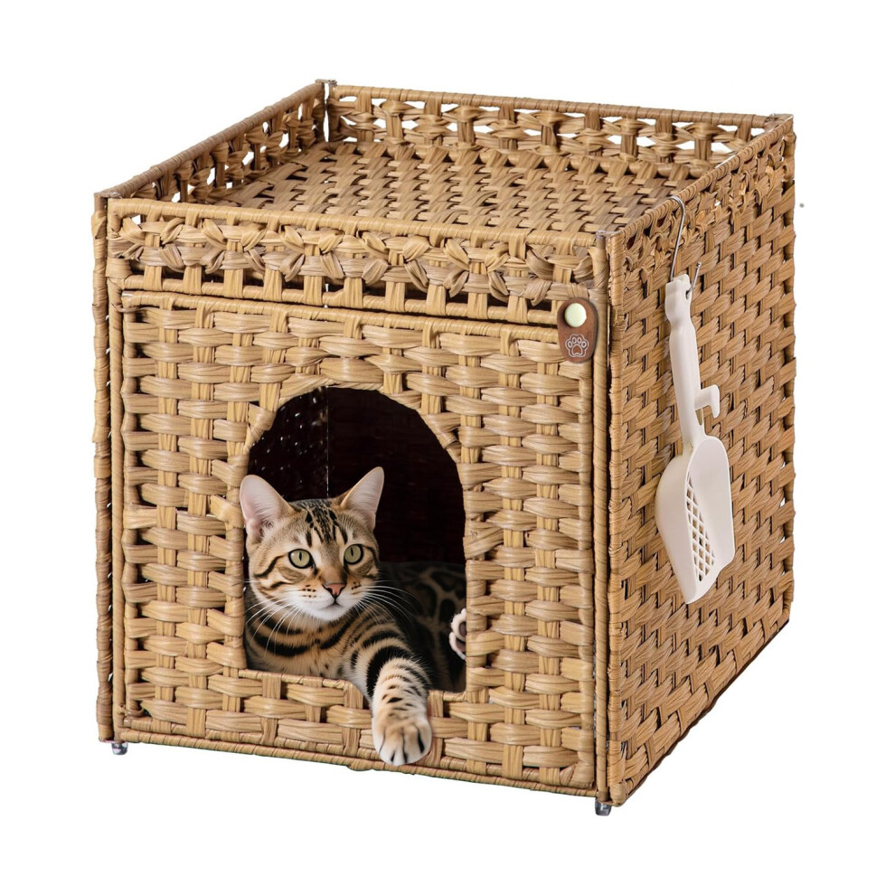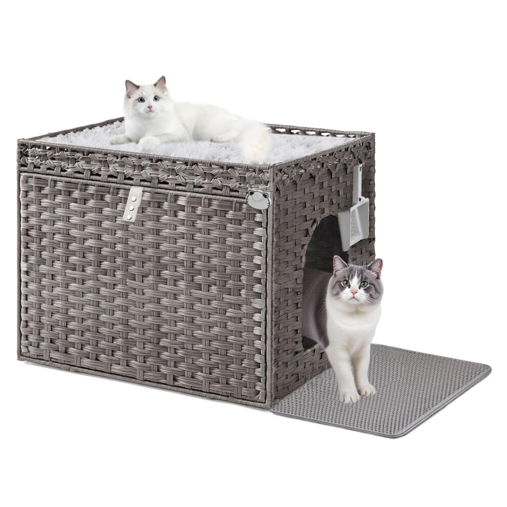 Klippehop Large Indoor Cat Litter Box Enclosure, Modern Handwoven Rattan Cat House Hidden Cat Litter Tray Furniture with Mat & S Hooks, Enclosed Cat