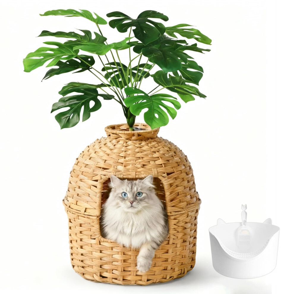 Klippehop Cat Litter Box Hidden Plant Enclosure, Handwoven PE Rattan Cat House, Wicker Cats Toilet Furniture for Indoor Corner Living Room Bedroom