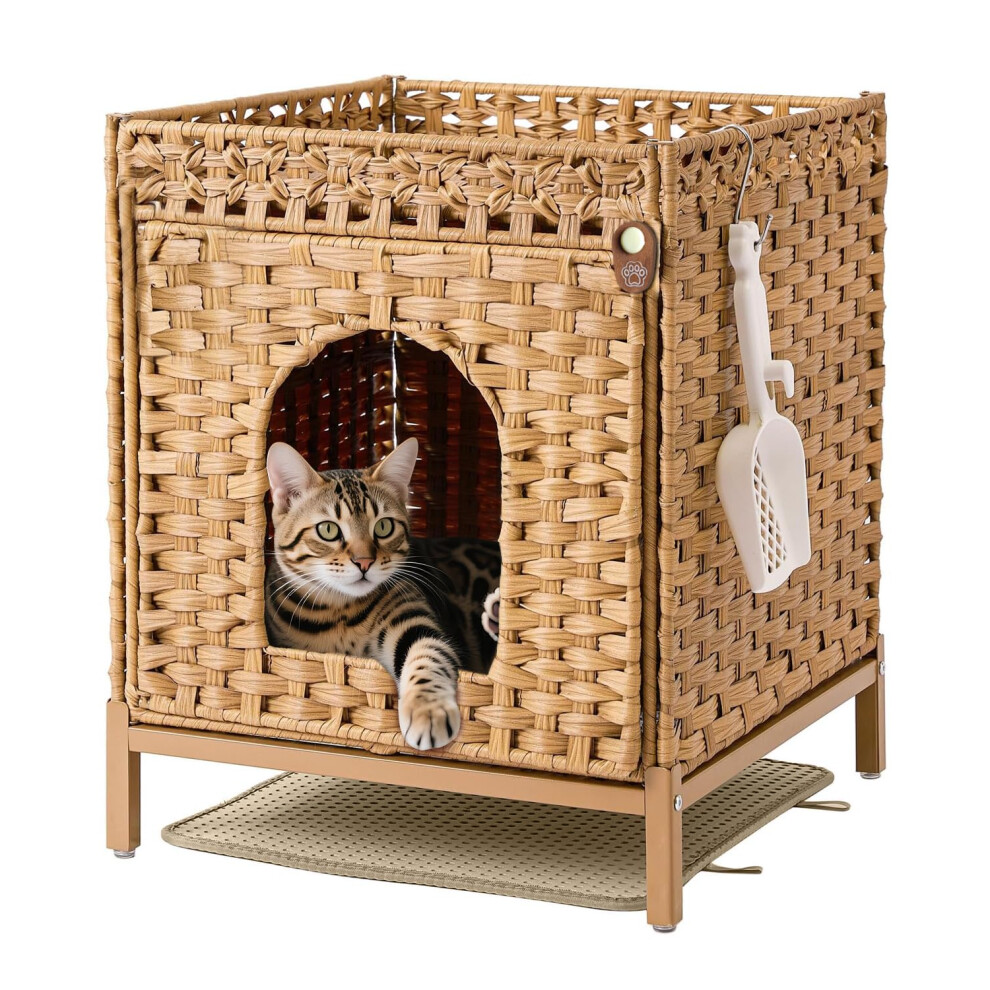 Klippehop Cat Litter Box Enclosure with Elevated Metal Base, Handwoven Rattan House Hidden Cat Litter Tray Furniture with 2 Mats & S Hooks, Detachable