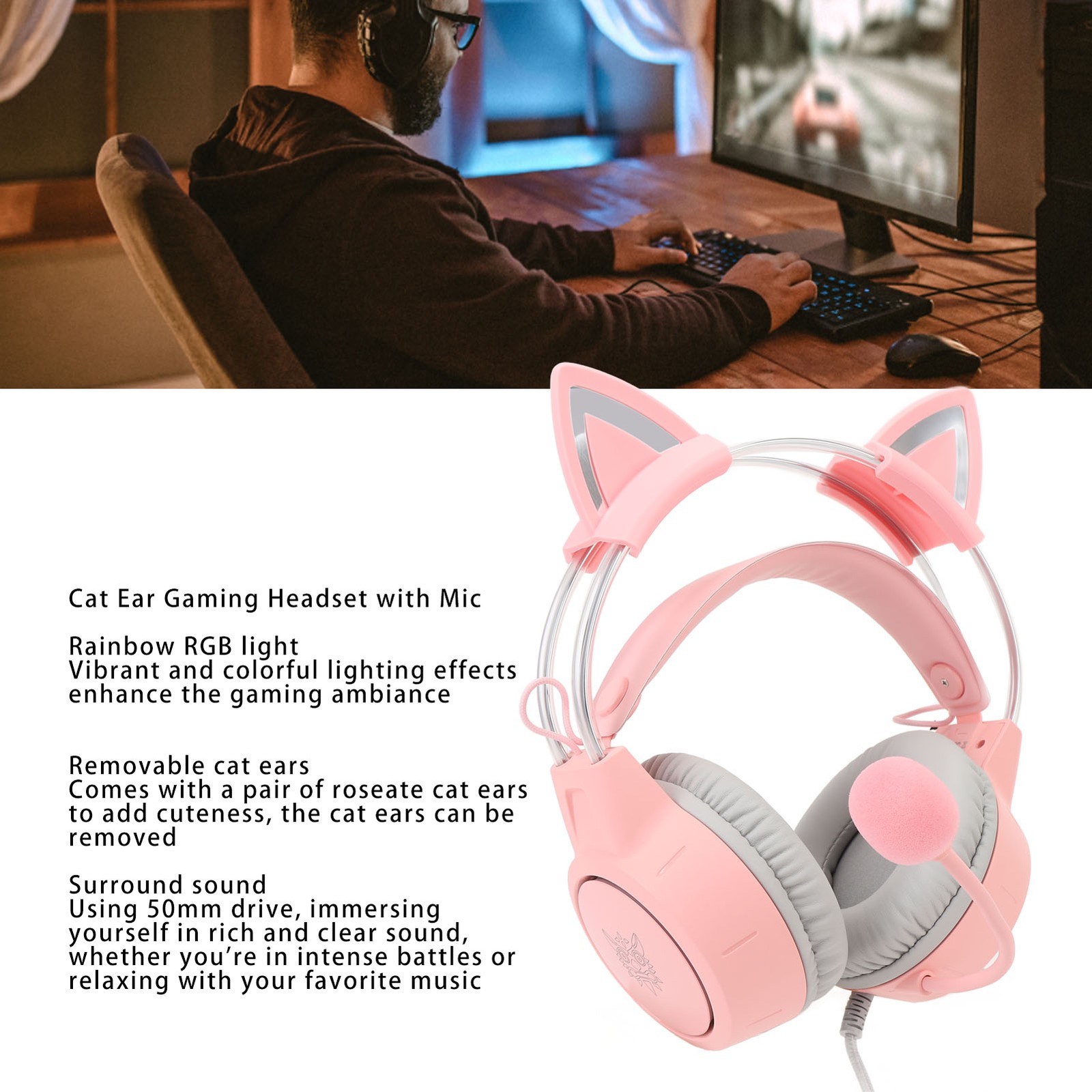 Cat Ear Gaming Headset Roseate RGB Light Adjustable Headband Wired Gaming Headph