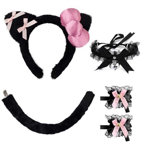 Satar Refes 4PCS Cat Cosplay Costumes Halloween Accessories Plush Furry Ear Headband with Bells Necklace Tail Animal Costume for Girls Women Adult Halloween Cosplay