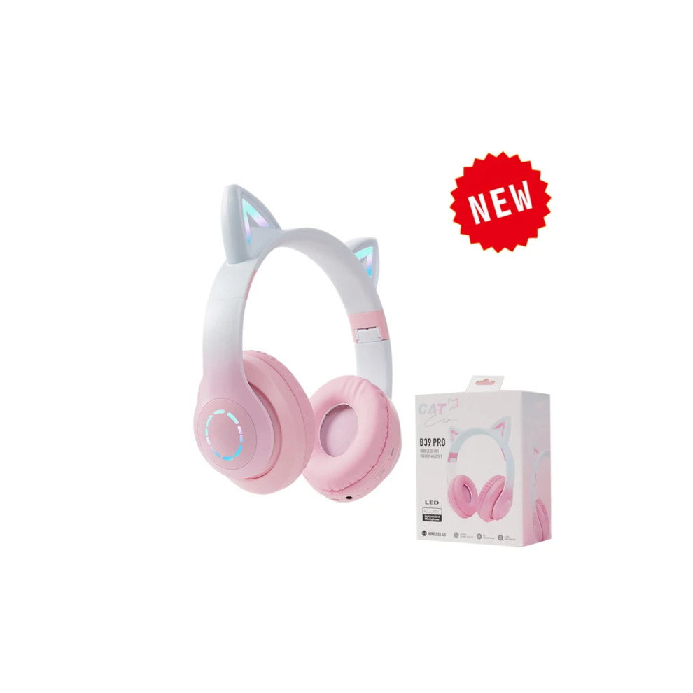 (B39B Pro Pink) Bluetooth Wireless Headphones Cat Ear Glow Light Stereo Bass Helmets Children Gamer Girl Gifts PC Phone Gaming Headset