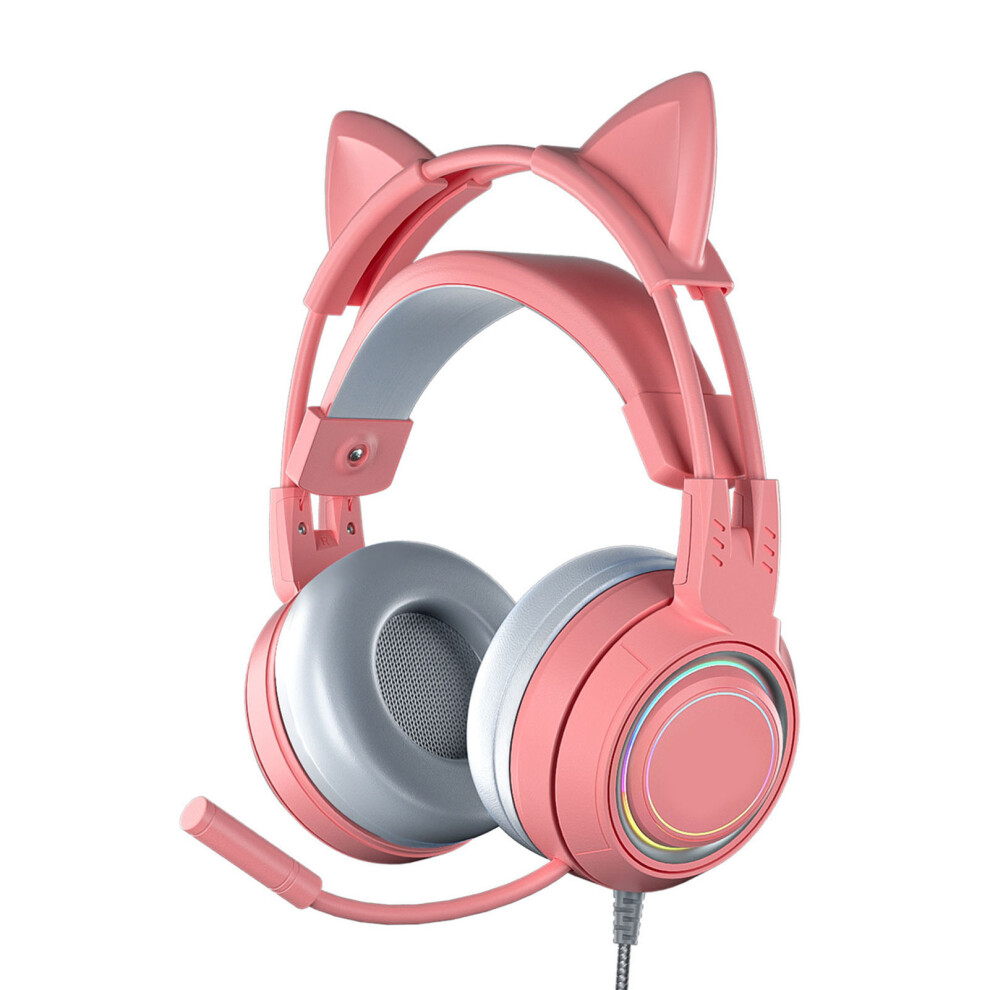 Gaming Headset With Cat Ears And RGB Effects Virtual 7.1 Surround Sound Noise Cancelling Microphone USB Pink Over Ear Headphones Memory Foam Ear Cushi