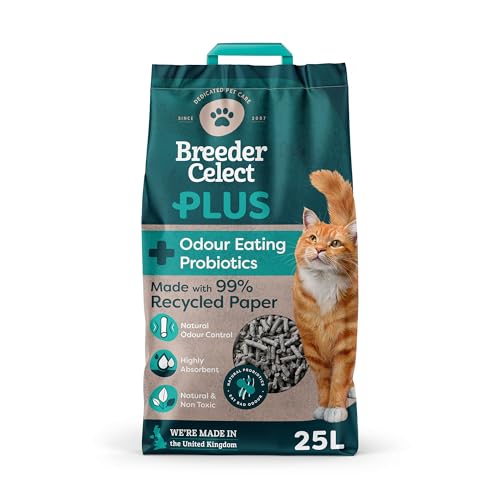 Breeder Celect Natural Cat Litter (20L) - 99 percent Recycled Paper, Absorbent Cat Litter Pellets, Optimal Odor Control, Non-Clumping, Biodegradable & Compostable - Made in UK
