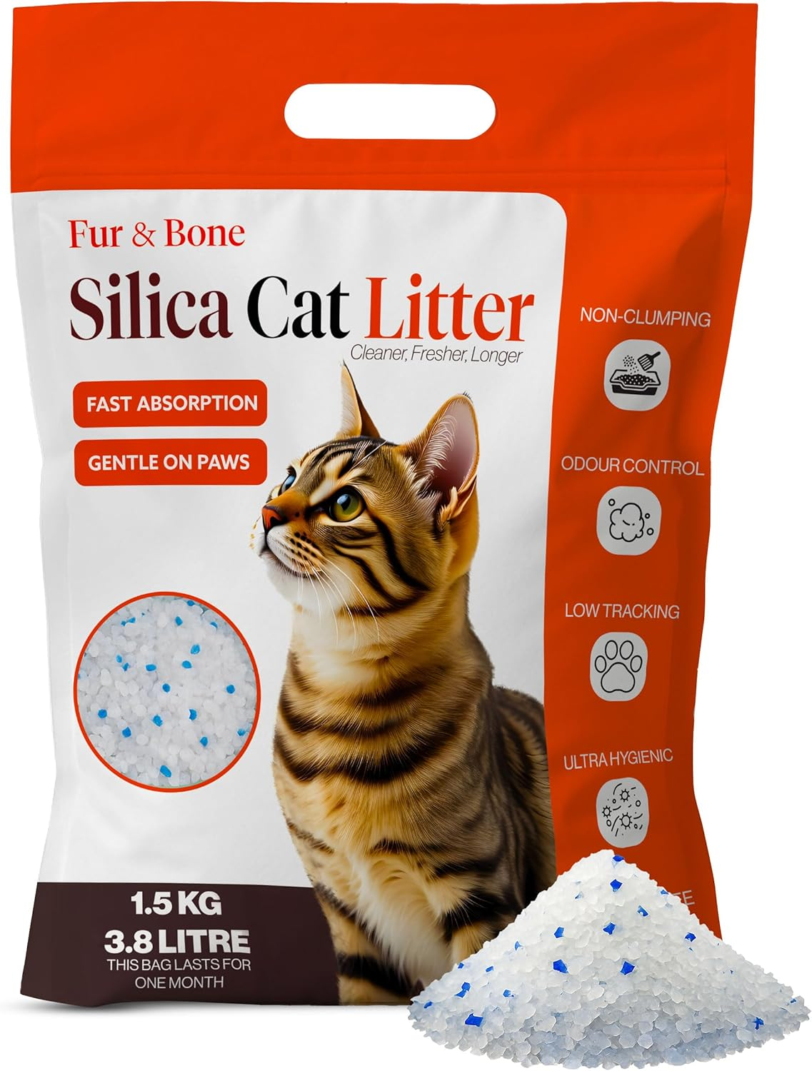 Fur & Bone 3.8L Silica Cat Litter - Non-Clumping Cat Litter Crystals - Ultra Absorbent, Fast-Drying & Low-Dust, Odor Control Crystal Granules, Easy to Clean for Housetraining Cats and Kittens