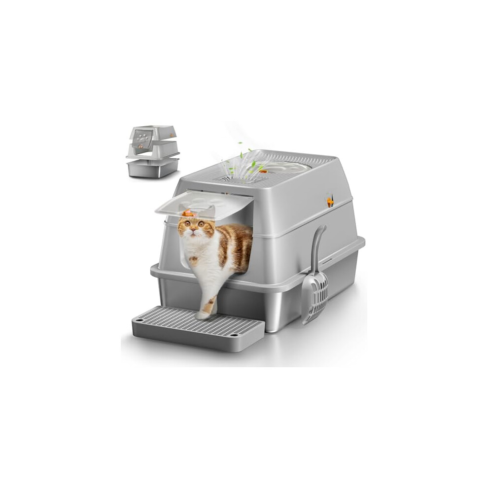 Stainless Steel Cat Litter Tray with Lid, XXL Enclosed Cat Litter Box with High Sided for Big Cats, with Removable Lid &Scoop - Grey
