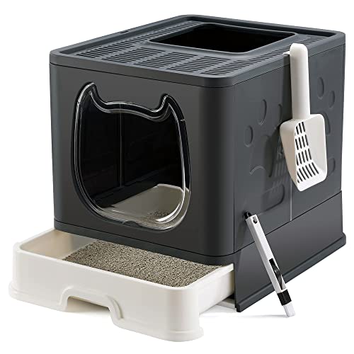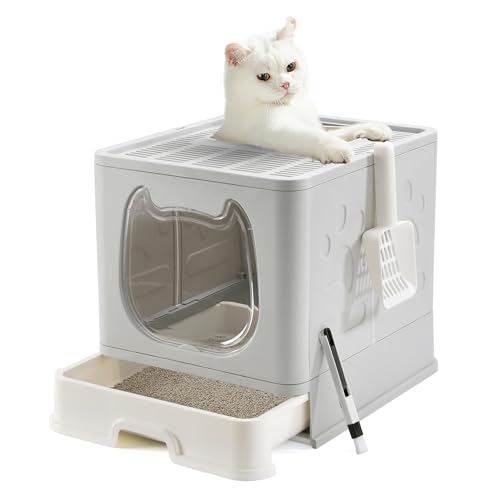 Pawsayes Cat Litter Tray Litter box with Lid for Medium and Small Cats, Foldable Top Entry Kitten Litter Box with Drawer Pan and Scoop