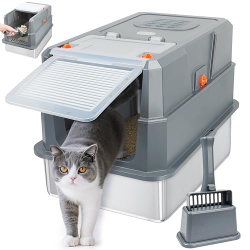 FURTIME Cat Litter Box High Sided Stainless Steel Litter Tray with Lid, 60cm Enclosed Metal Extra Large Litter Tray for Big Cat, Enclosed and Open Type Dual-Use, 60x40x45cm