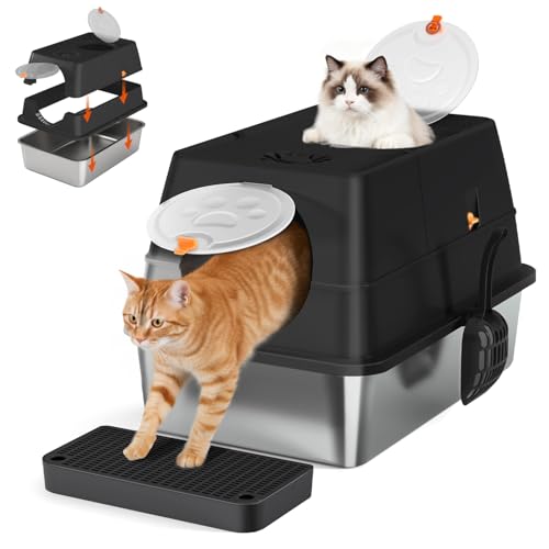 Vivifying Stainless Steel Cat Litter Tray, High-Sided, Removable and Metal Enclosed Stainless Steel Cat Litter Box with Lid with Scoop, Steps and Mat (Black)