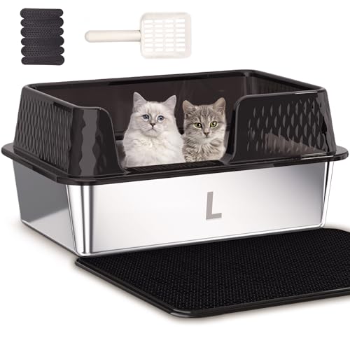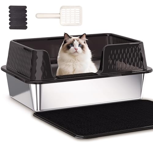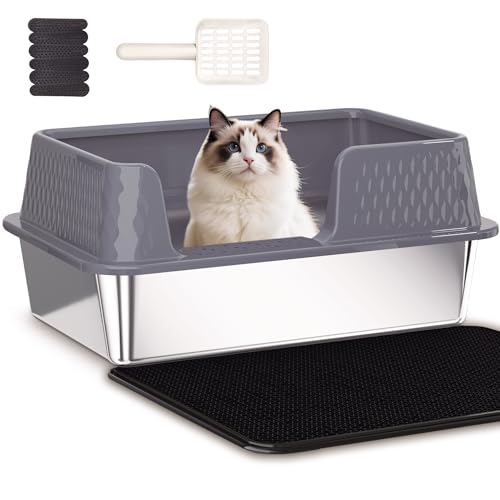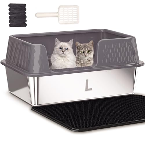 Pawsayes Stainless Steel Cat Litter Box with Lid for All Cats Extra Large Cat Litter Trays with 15cm Anti-Splash High Wall Sided Enclosure Cats Litter Tray (50x35x25 cm) (Grey)