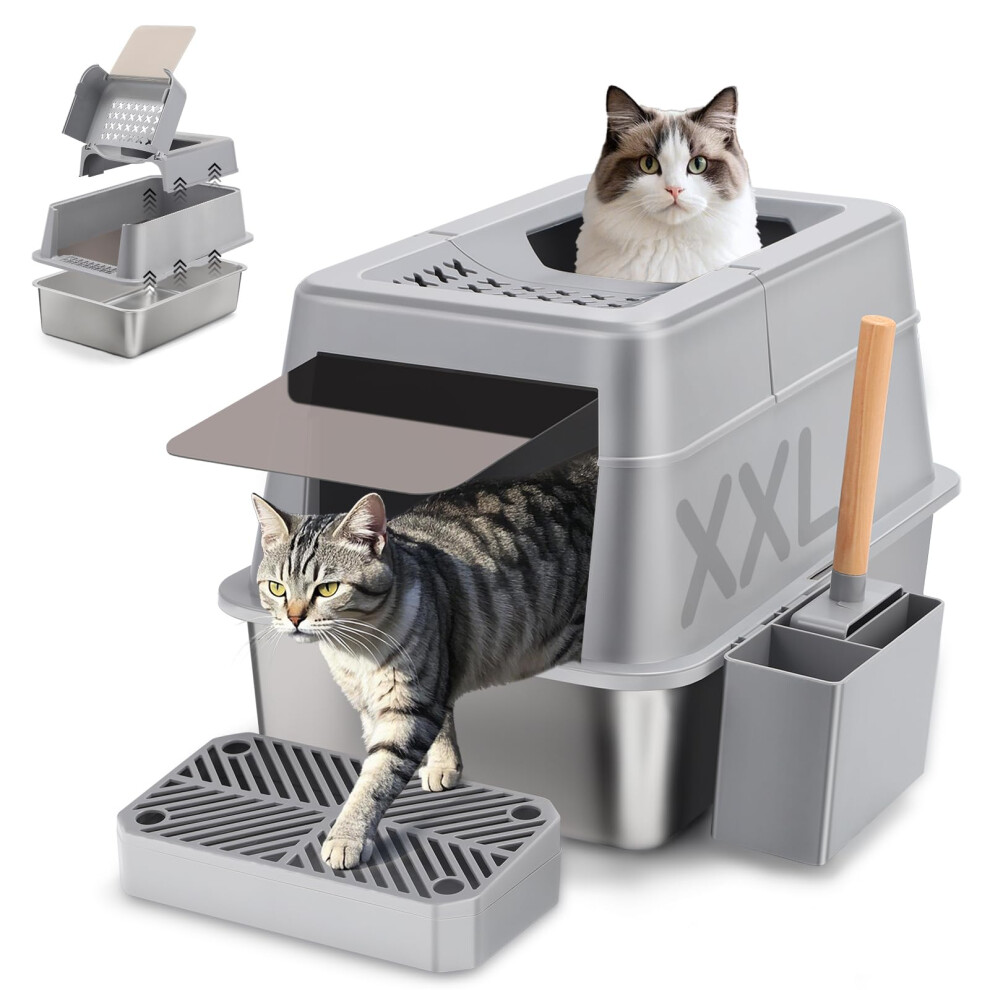 SZEETECH XL Enclosed Stainless Steel Litter Box, Odour-Resistant, Easy to Clean, Dual-Mode (Enclosed & Semi-Enclosed), Cat Litter Tray with Lid, with