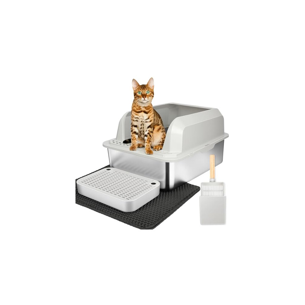 SZEETECH XL Enclosed Stainless Steel Litter Box, Odour-Resistant, Easy to Clean, Stainless Steel Cat Litter Tray with Lid, with Scoop, Step and Mat -