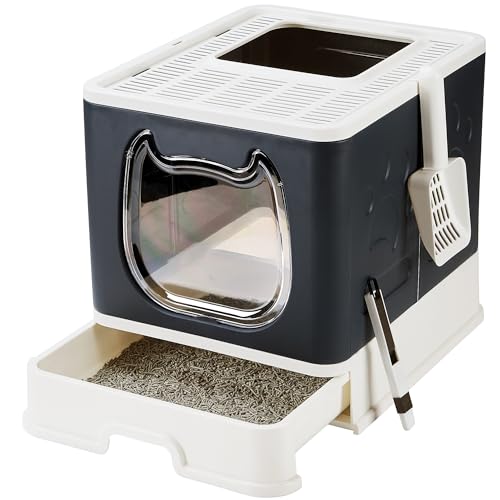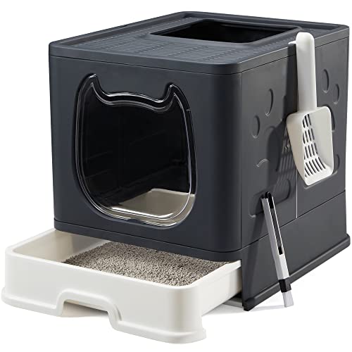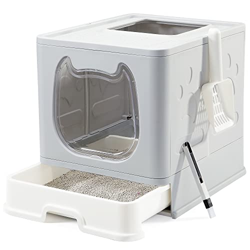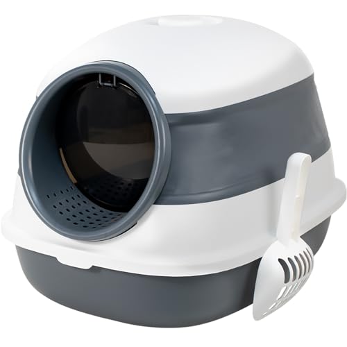 FURRYPAWS Cat Litter Tray Enclosed Easy Clean Cat Litter Box with Lid,Foldable Litter Tray with Activated carbon Filter,Scoop (Grey)