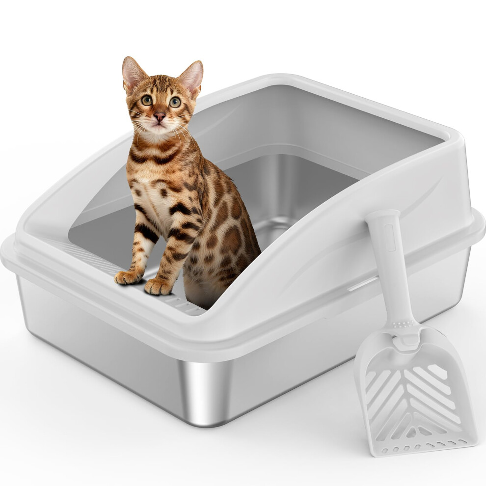 FURRYPAWS XL Stainless Steel Cat Litter Tray with Lid,50L Extra Large Metal Cat Litter Box for Big Cats ,61x41x30cm, High Sided Litter Tray, With Litter Scoop