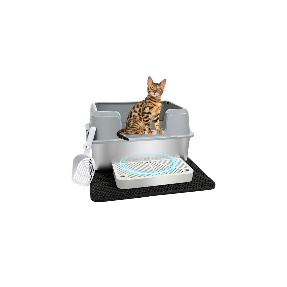 Citylife XL Stainless Steel Cat Litter Tray with Lid, Extra Large Enclosed Metal Litter Box with Litter Scoop&Double Layer Litter Mat, Non-Sticky,