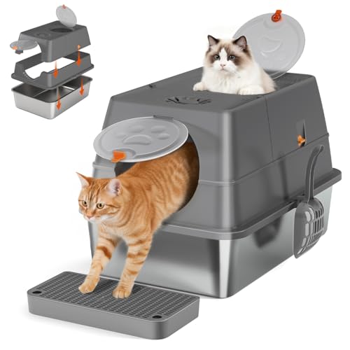 Wooaidagg Stainless Steel Cat Litter Tray with Lid, Large Covered Metal Cat Litter Box with Scoop and Mat for All Cat,Odour Control,Non Stick Surface,Easy Clean (Dark Grey)