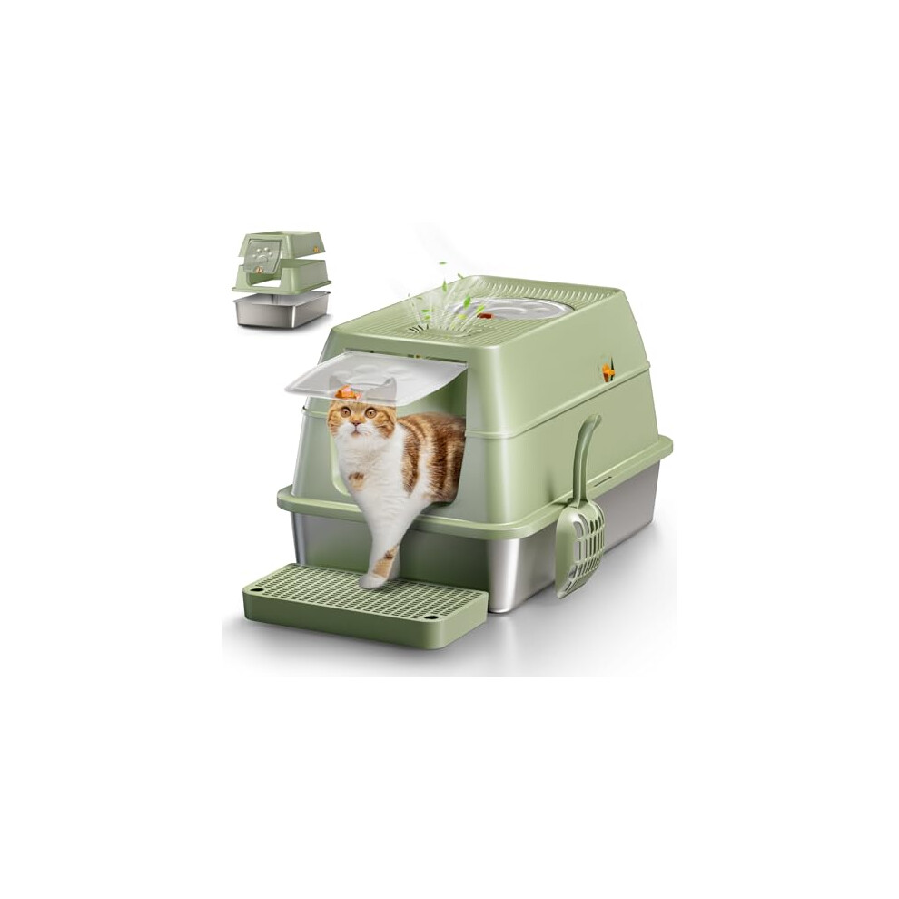Stainless Steel Cat Litter Tray with Lid, XXL Enclosed Cat Litter Box with High Sided for Big Cats, with Removable Lid &Scoop - Green