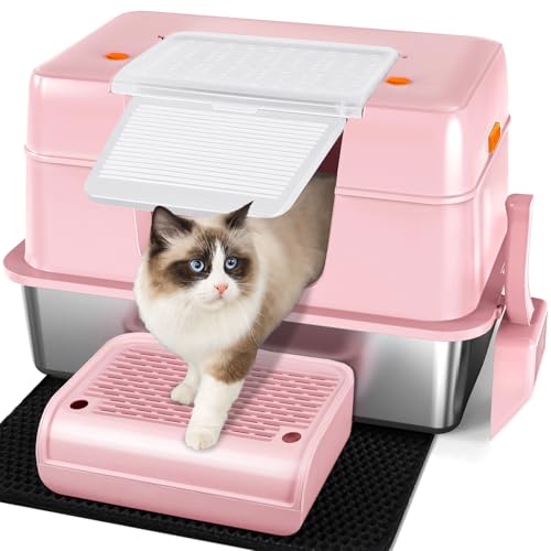 Vivifying Stainless Steel Cat Litter Tray, High-Sided, Removable and Metal Stainless Steel Cat Litter Box with Lid with Scoop, Steps and Mat (Pink)