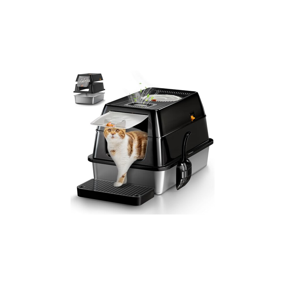 PalNests Stainless Steel Cat Litter Tray, 105° Flip Lid Large Cat Litter Box, Metal Kitten Litter Tray with Fresh Air Deodorization System, High Sided XXL Pet Toilet with Litter Deodorizer, Scoop, Mat